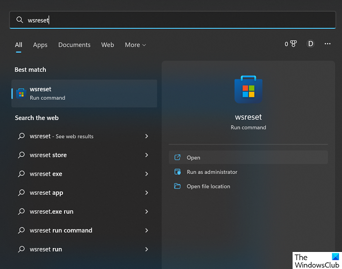 - Open the Search menu on the Taskbar and search for “wsreset”