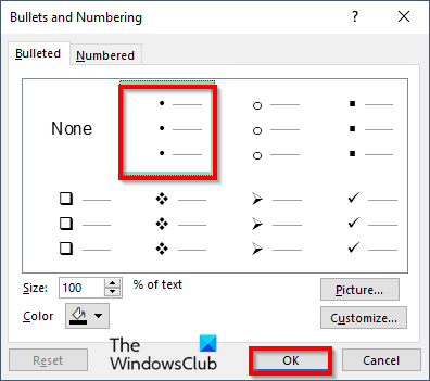 - In the Bullets and Numbering dialog box, you can increase or decrease the size of the bullets or even change the color of the bullets.