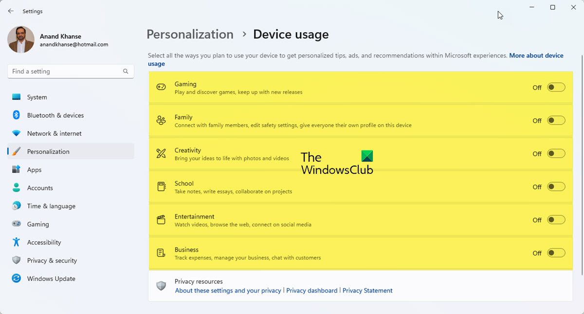 The Device usage that is chosen will tell Microsoft how you plan to use the computer. This will cause Windows to display personalized ads, tips, and recommendations according to the device usage that you chose. If you did not choose device usage when you were setting up or wish to make any changes to the device usage, you can do so at any time by following the steps in this article.
