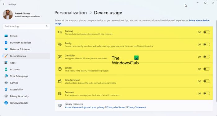 In this post, we will show you how to change or set Device usage in Windows 11. Windows 11 is so considerate; you can do a speed setup and skip certain things and then go back later to finish up. Windows allows you to skip certain things and do them at a later time when it is convenient. As long as the settings are not very important to the operation of Windows, you can skip them. It is, however important to know how to change or set Device usage in Windows 11.