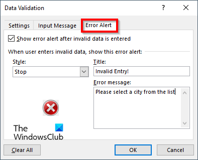 Ensure that the checkbox for the “Show error alert after invalid data is entered.”