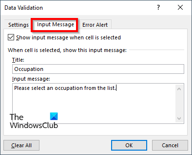 If you want to add a message pop up, you can click the Input Message tab and check the checkbox for “Show input message when cell is selected.”