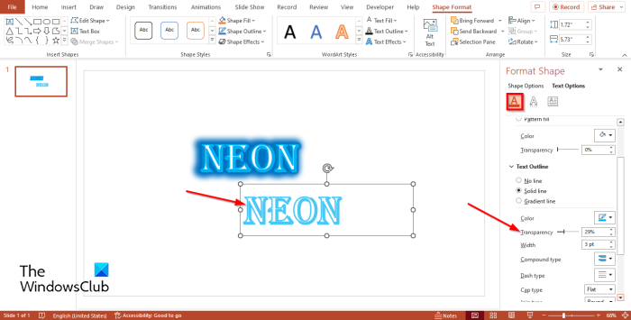 Follow the steps below on how to add a neon effect to text in PowerPoint.