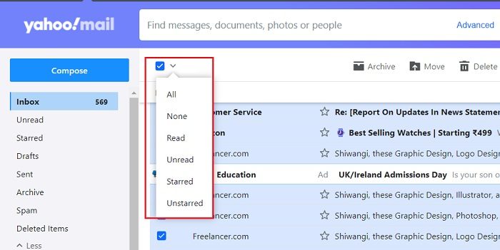 Can we select all the emails in Yahoo?