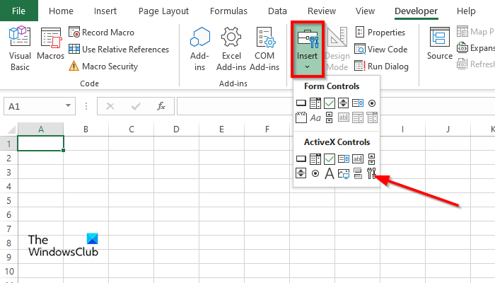 - Click the Insert button and select More Controls under the Active X Controls section.