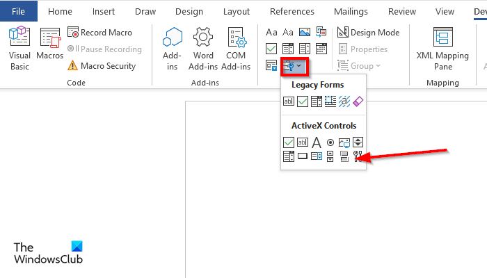 - Click the Developer tab and click the Legacy Tools button in the Controls group.
